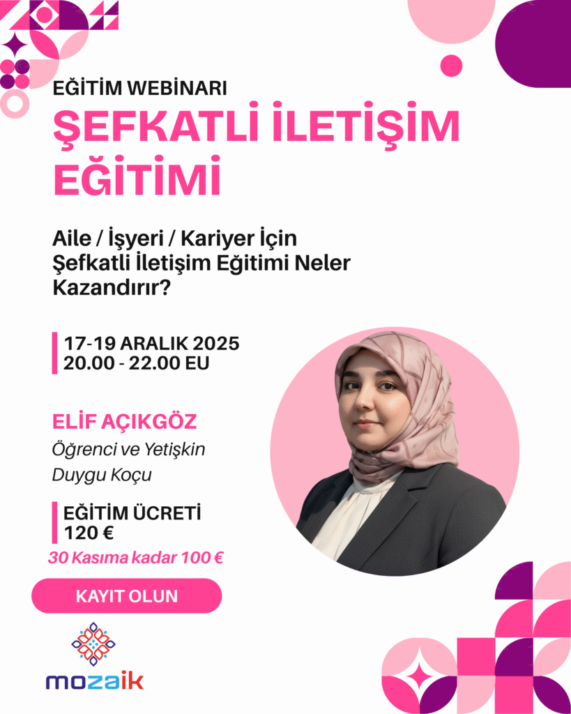 ❗Sınırlı Kontenjan – Kaçırmayın! €125 €100 🔥 Erken Kayıt Fırsatı: 100€ 🌿 Aileler İçin Şefkatli İletişim Eğitimi Neler Kazandırır? 1. Aile İçi Bağı Güçlendirir• Eşler, ebeveynler ve çocuklar arasında karşılıklı anlayış ve güven duygusu artar.• “Kim haklı?” tartışmalarından çıkıp “birbirimizi anlamaya” geçilir. 2. Empatik Dinleme Becerisi Geliştirir• Aile üyeleri kendilerini ifade ederken gerçekten duyulduklarını ve […]